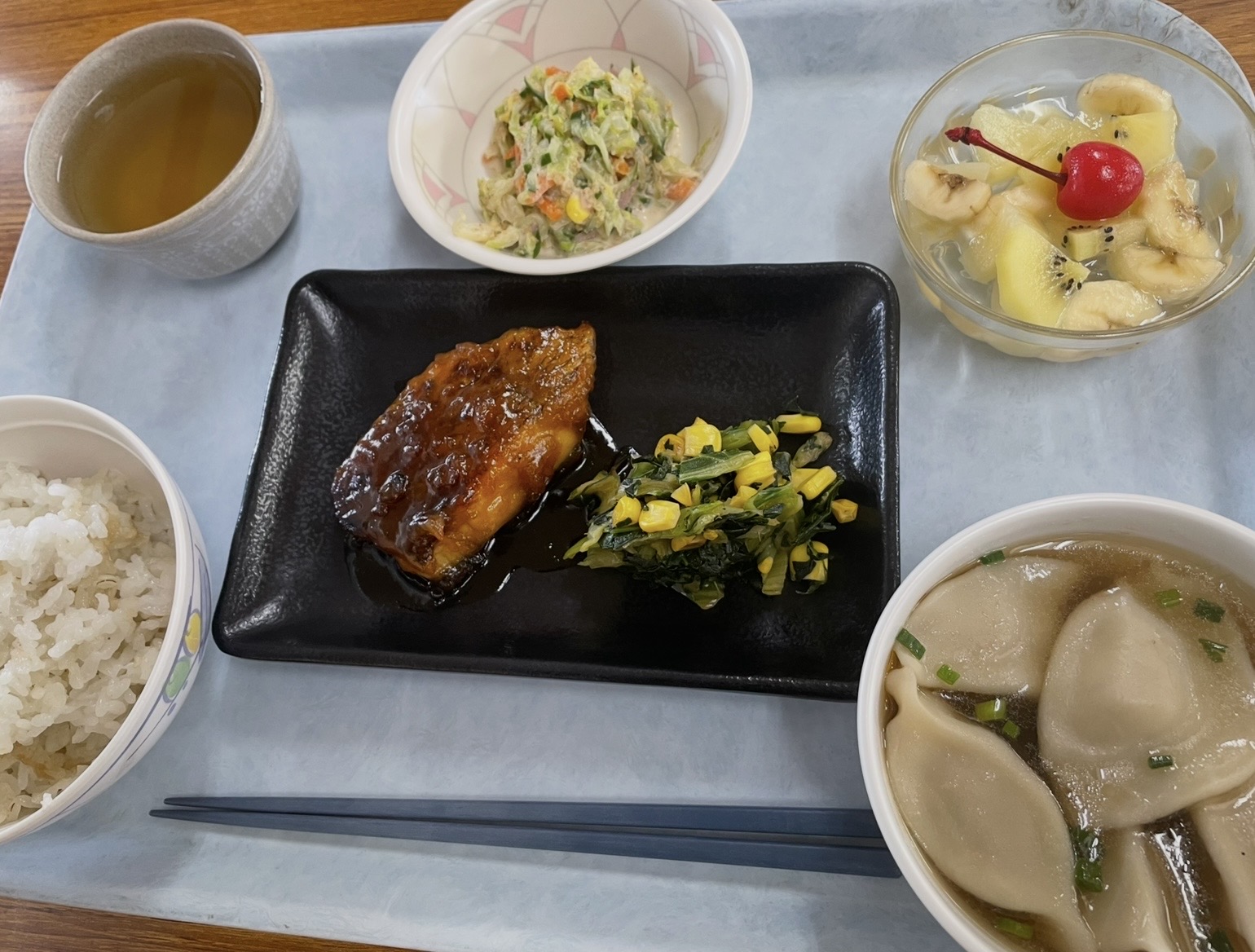メインの「鯛の照り焼き」は、甘辛いタレがふっくらとした身によく絡み、ご飯が進む一品。添えられた青梗菜とコーンの黄色が、黒いお皿に映えて目でも楽しませてくれます。