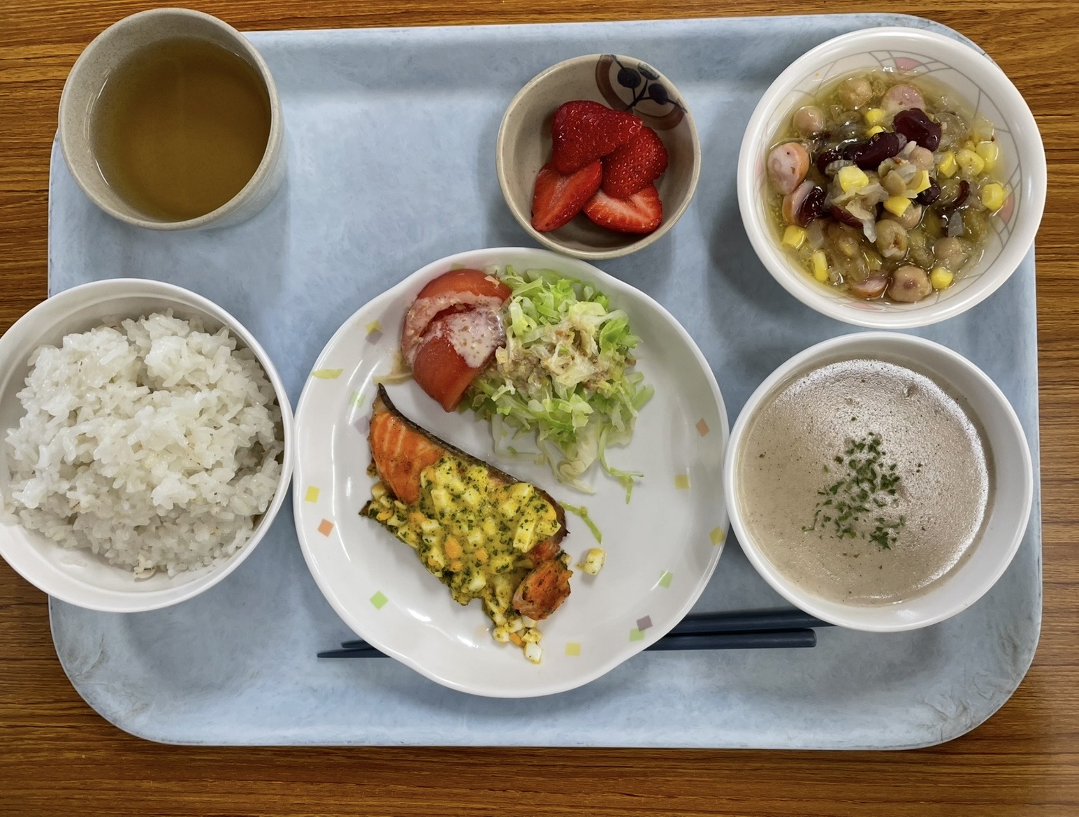 本日の昼食は、見た目にも鮮やかで、季節感と栄養バランスを大切にしたメニューをご提供しました。