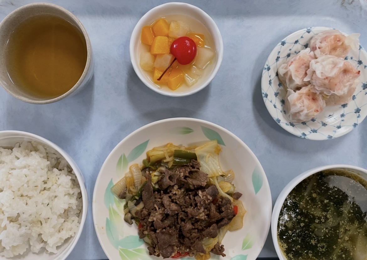 【本日の昼食】スタミナ満点!焼肉風炒めとカニ入りシュウマイ