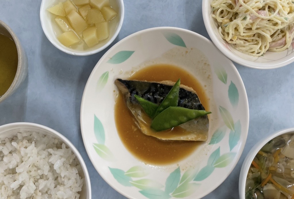主菜はサバの煮付け。ほどよく脂ののったサバに、甘辛いタレがしっかりと染み込み、食欲をそそります。上に添えられた絹さやの緑が彩りを添え、見た目にも落ち着いた美しさがあります。